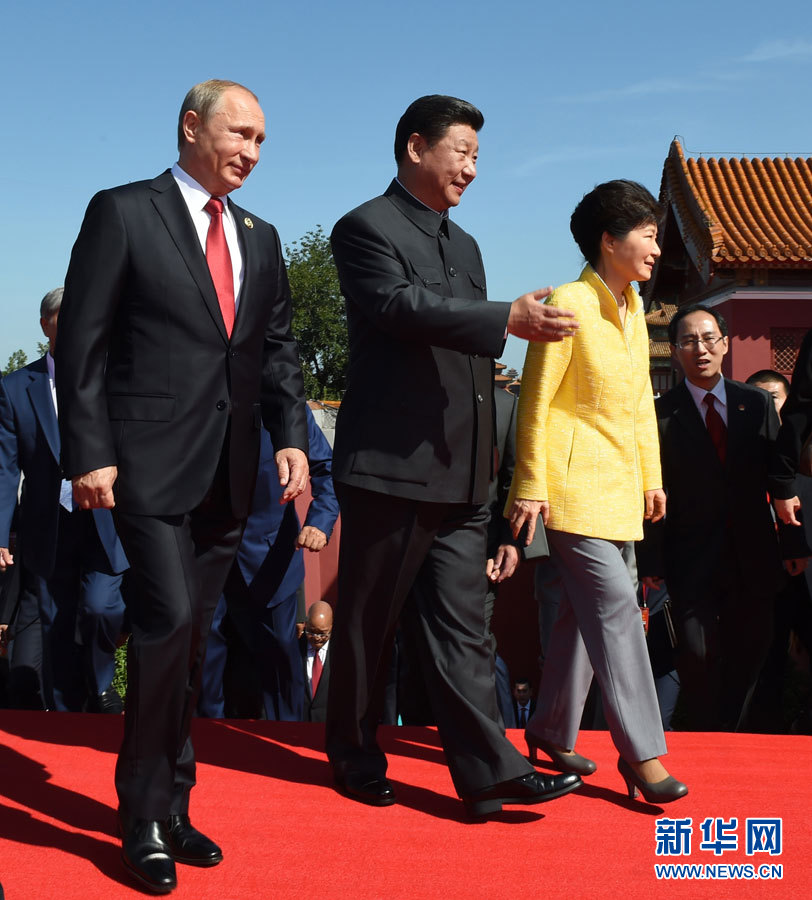 9月3日,纪念中国人民抗日战争暨世界反法西斯战争胜利70周年大会在北京天安门广场隆重举行。这是习近平和与会嘉宾一同登上天安门城楼。新华社记者谢环驰摄