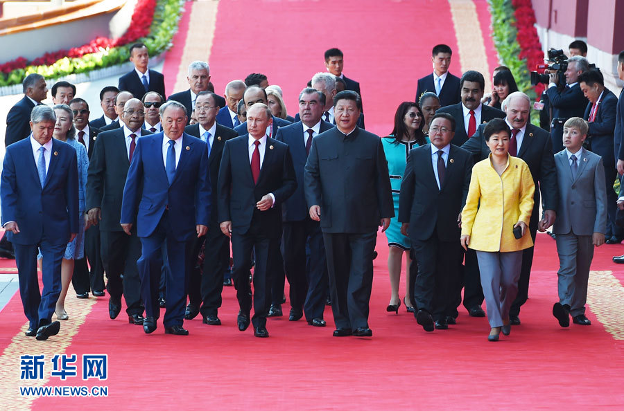 9月3日,纪念中国人民抗日战争暨世界反法西斯战争胜利70周年大会在北京天安门广场隆重举行。这是纪念大会开始前,中共中央总书记、国家主席、中央军委主席习近平同外方领导人一起前往天安门城楼。新华社记者王晔摄