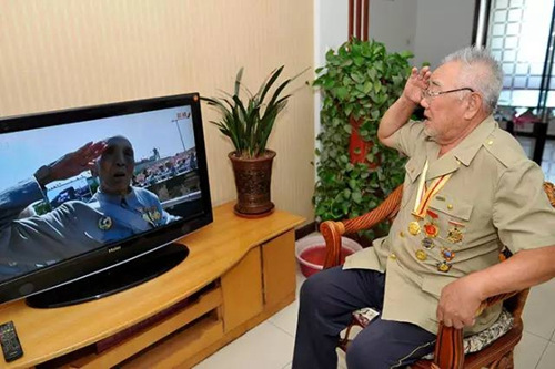 然而,能到北京、到天安门广场的老兵毕竟是少数人。更多曾经经历过艰苦辉煌岁月的老兵,在祖国各地的家中观看大阅兵。他们最年轻者已近九旬,满头白发的他们有的双腿已孱弱得无法直立,有的双眼已昏花得看不清电视,但当国旗升起、国歌响起、老兵方阵驶过天安门时,他们还是用最大力气敬起军礼。