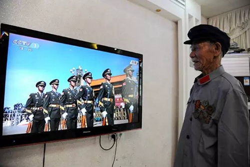 在江西省万载县鹅峰乡多江村,95岁抗战英雄徐桃生正在收看抗战胜利70周年阅兵盛况。徐桃生19岁参军,曾参加过著名的浙江金华保卫战。3日,他特意穿上红军的服装,把珍贵的勋章挂在胸前。看着阅兵场上的年轻人,老人笑得像个孩子。