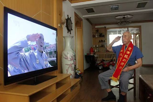 96岁抗日老兵张宝宪曾跟随部队辗转半个中国,负伤32次。当看到电视里升国旗时,这位年过九旬的老人哭了起来,什么话也说不出来。当看到电视里的出现坦克时,张宝宪问儿子:“这些坦克是咱们的吗?”张宝宪说:“我要活到下一个阅兵,躺着也要去看!”