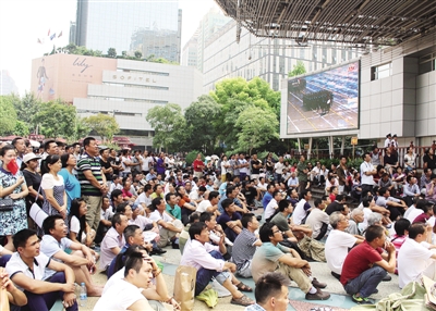 ▲ 上海南京路步行街世纪广场上挤满了观看阅兵式实况转播的人群。 本报记者 李治国摄