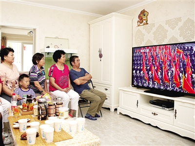 ▲ 北京西城区右安门街道群众在家里收看直播。本报记者 高兴贵摄