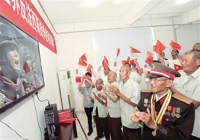 “我们感到十分高兴和荣耀,能看到如今国家的繁荣昌盛,就算当年我们参加的战斗很艰苦,可是为了捍卫国家主权、民族尊严,为了现在社会的和谐稳定,流血牺牲都是值得的。”老干部王奎说。当听到《保卫黄河》《游击队歌》等抗战革命歌曲响起时,现场许多老干部都情不自禁地跟着大声唱。看到鲜艳的五星红旗冉冉升起,抗战老兵自豪地向国旗敬军礼。