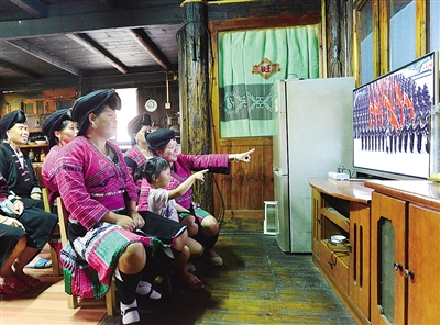 ▲ 广西龙胜的瑶族群众观看阅兵直播。 韦吉阳摄(新华社发)