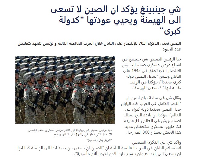 瑞士《伯尔尼日报》网站以《中国来了》为题发表文章,以问答的形式介绍了有关中国阅兵仪式的8个相关内容,其中第一部分就是,中国阅兵将释放这样一种信号——中国是有责任意识的和平大国和军事强国。