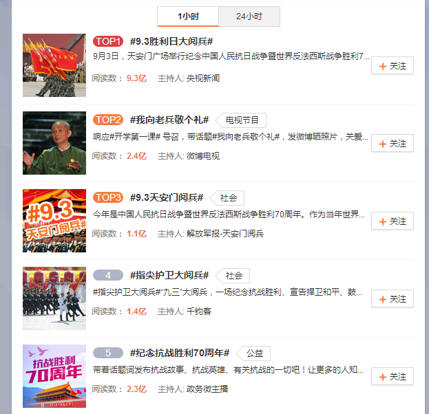 9月3日上午,新浪微博一小时内热门话题榜前十位,全部被抗战胜利纪念相关主题占据,微博前五位话题总阅读量累计超过16亿次。 微博截图