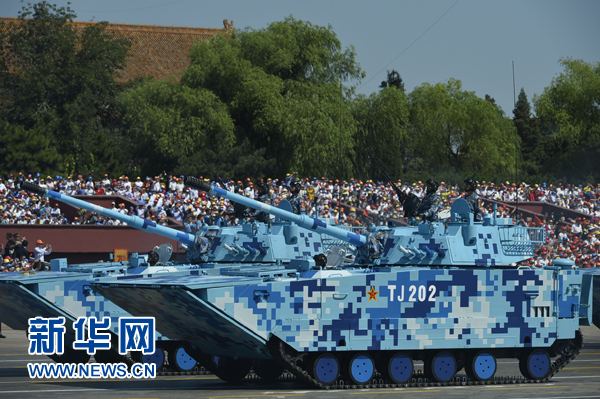 9月3日,中国人民抗日战争暨世界反法西斯战争胜利70周年纪念大会在北京隆重举行。这是陆战队两栖突击车方队通过天安门广场。新华社记者彭昭之摄