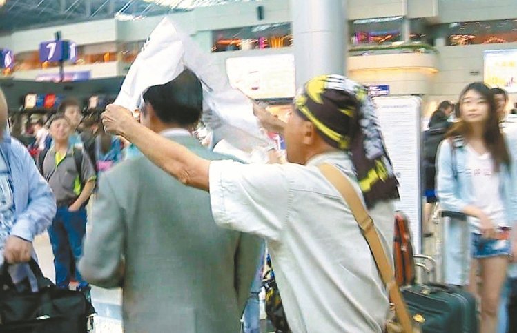8月30日,连战一行在机场受到“台独”分子的谩骂与攻击,图为连战幕僚张荣恭接受采访时被无礼“抗议”