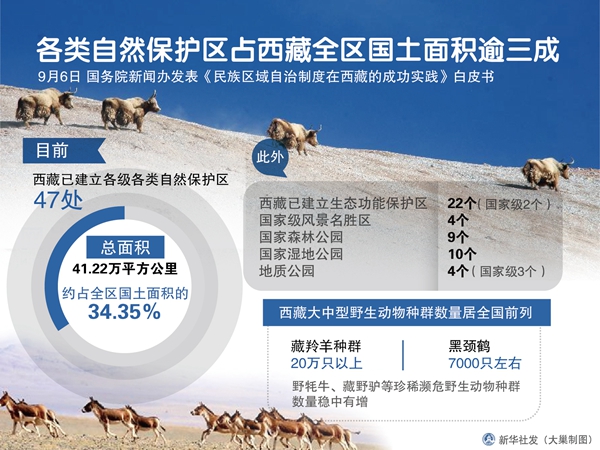 新华网北京9月6日电(记者崔静、任珂)国务院新闻办6日发表的《民族区域自治制度在西藏的成功实践》白皮书说,西藏生物多样性与重要生态功能区得到有效保护。目前,西藏已建立各级各类自然保护区47处,总面积41.22万平方公里,约占全区国土面积的34.35%。