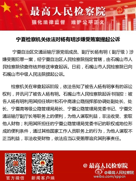 据最高人民检察院官方微博消息,宁夏自治区交通运输厅原党组成员、副厅长杨有明(副厅级)涉嫌受贿犯罪一案,经宁夏自治区人民检察院指定管辖,由石嘴山市人民检察院侦查终结并移送审查起诉。日前,石嘴山市人民检察院已向石嘴山市中级人民法院提起公诉。
