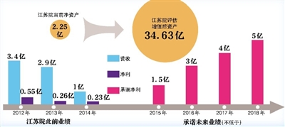 按此承诺,2015年江苏院的净利润将同期增长552%。“看看江苏院2012年到2014年的业绩,你就知它对2015年到2018年的承诺是骗人的。”一位股民称。真的是这样吗?