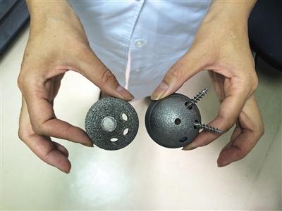 人工髋关节中的臼杯,左侧为3D打印出来的臼杯,右侧为国产臼杯。 记者 王卡拉 摄