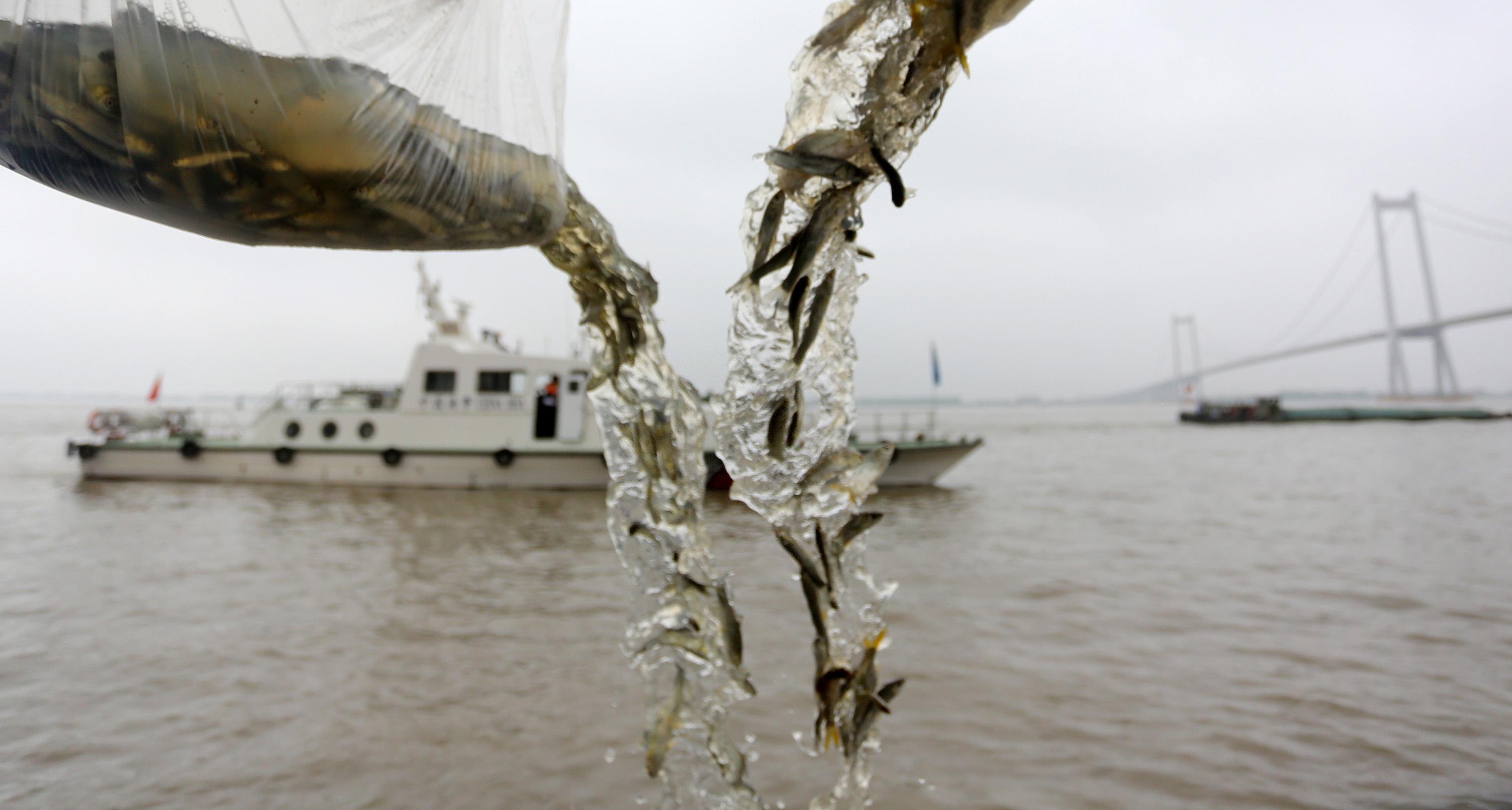 6月26日,渔民在长江江苏省泰州市高港区永安洲段放流鱼苗。