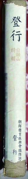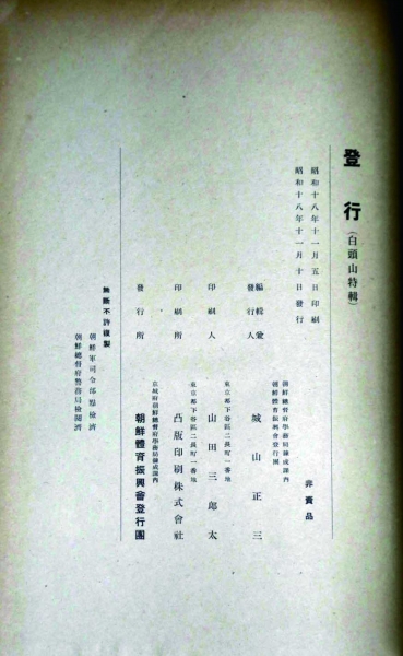 记者看到, 该书书皮各角已陈旧斑驳,为大开本30×22厘米,共228页。纸质护封正面为字加图,最上端字为书名“登行”,“书名下为小字“白头山特辑”。字下端是一张用前面是日本国旗,后面以长白山为背景的照片。护封内为封布面硬精装。印刷日期为:昭和十八年十一月五日,发行日期为昭和十八年十一月十日。印刷所为东京都下谷区二长町一番地凸版印刷株式会社。在该书尾页标明为非卖品,并强调“无断不得复制”。