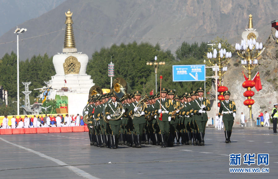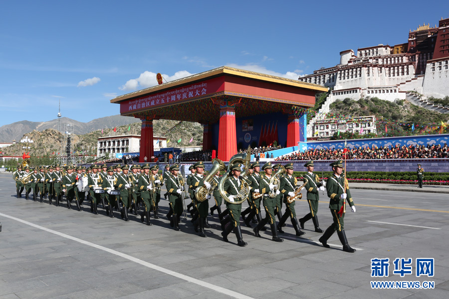 今年是西藏自治区成立50周年。9月8日上午10时,西藏自治区成立50周年庆祝大会在拉萨市布达拉宫广场举行。图为大会军乐队入场。新华网 田富升 摄