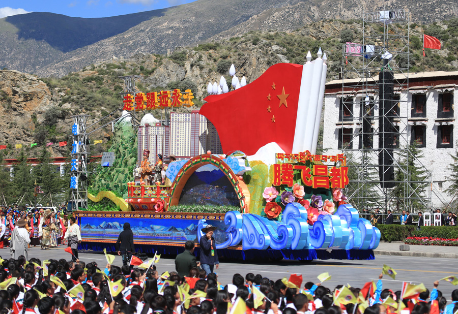 今年是西藏自治区成立50周年。9月8日上午10时,西藏自治区成立50周年庆祝大会在拉萨市布达拉宫广场举行。图为游行队伍中的彩车。新华网 邢兵帅 摄