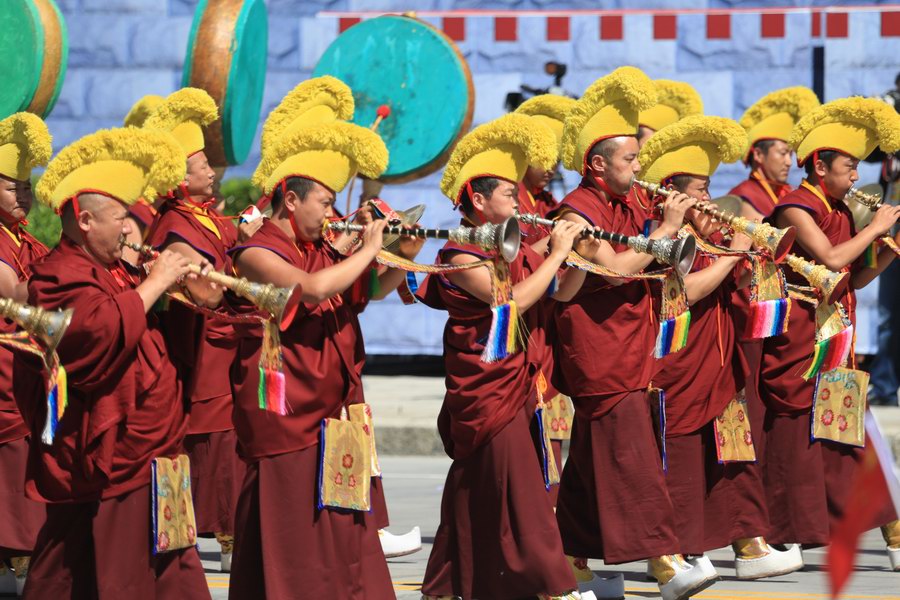 今年是西藏自治区成立50周年。9月8日上午10时,西藏自治区成立50周年庆祝大会在拉萨市布达拉宫广场举行。图为行进中的民族大团结游行队伍。 新华网 邢兵帅 摄