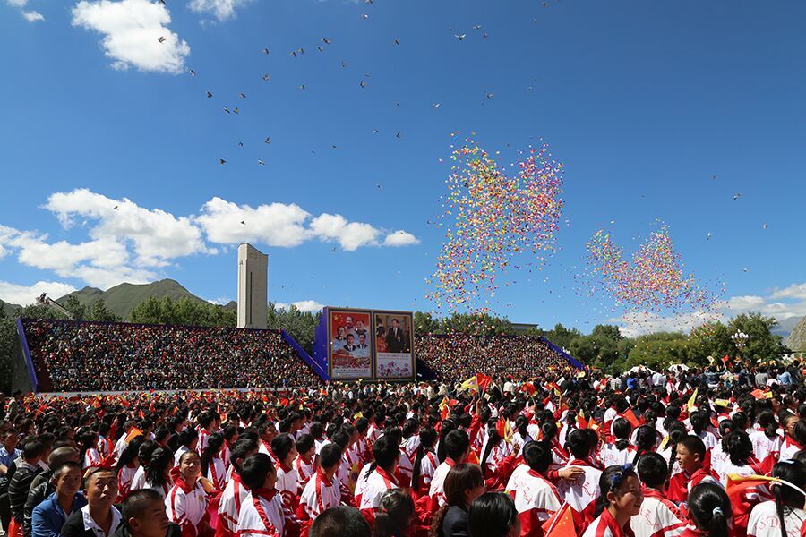 今年是西藏自治区成立50周年。9月8日上午10时,西藏自治区成立50周年庆祝大会在拉萨市布达拉宫广场举行。图为多彩气球和鸽子飞向布达拉宫广场上空。新华网 孙汝文 摄