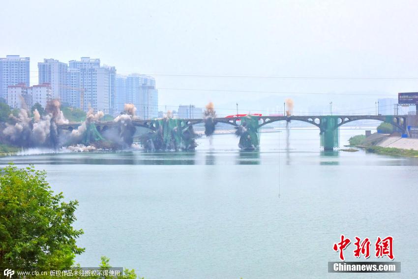 2015年09月08日,湖南张家界,9月8日上午12时18分,地处湖南省张家界市中心城区的澧水大桥被成功爆破拆除,这座承载了40多年风雨的大桥终于结束使命。据悉,这次爆破共用雷管2888发,炸药近一吨,其中最大单段起爆药量就达217公斤。图片来源:CFP视觉中国