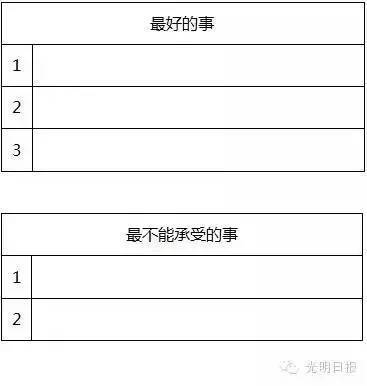 先来做个测试,试试看,想出5件你认为会对于你生命影响最大的事情,3件“最好的事情”,2件“最不能承受的事情”脑补一下下面的表格。