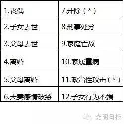 对于生命影响最大的负面事件中,排名前12的分别是: