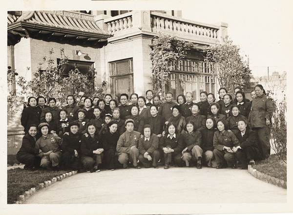资料图片:1951年10月,宋庆龄(二排右五)、邓颖超(二排右六)何香凝(二排右四)李德全(二排右三)接见出席全国政协一届三次会议的女代表。后排中为雷洁琼