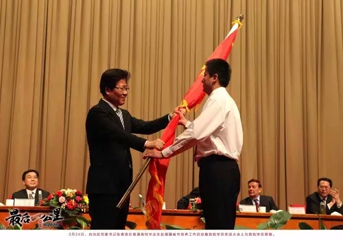 2011年3月24日,张春贤在普通高校毕业生赴援疆省市培养工作启动大会上为首届学员授旗