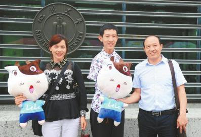 9月12日,四川大学江安校区,彭超和父母在校园门口合影。