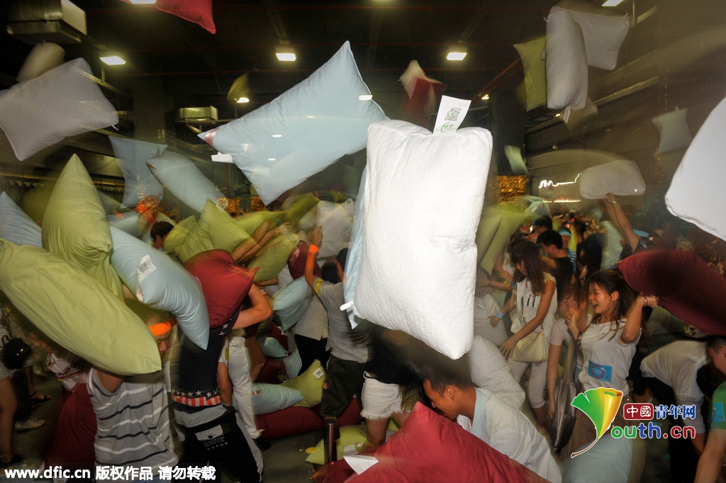 2015年9月12日晚,广东佛山,佛山创意产业园开启千人枕头大战甜蜜模式,手持枕头,爱砸谁就砸谁,一片混战,羽毛飞舞,年轻男女享受以这样的方式,释放压力。