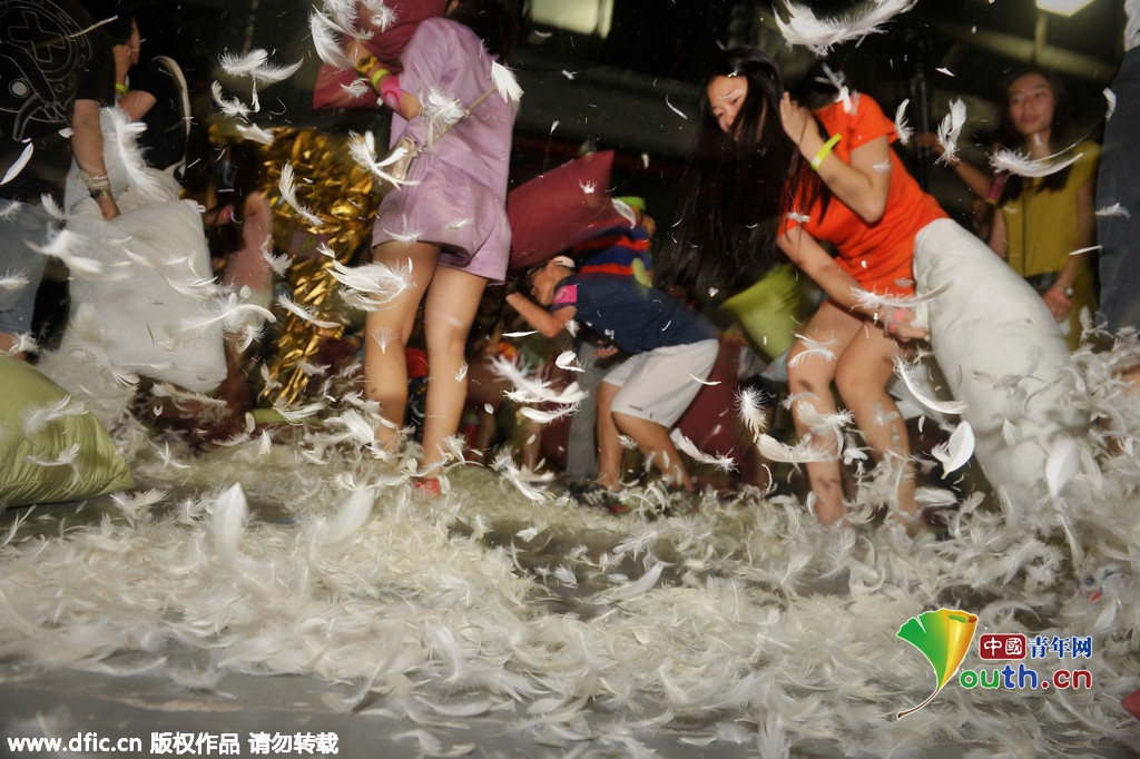 广东佛山年轻男女千人甜蜜枕头大战 羽毛翻飞
