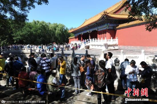 9月12日是故宫《石渠宝笈特展》迎来的第一个周末,大清皇帝的近300件压箱底儿的宝贝让等待参观的游客排起了近一站地的长龙。由于展厅实行200人的参观限流,工作人员不得不广播提醒:“今天参观观众较多,排队至少需要6个小时”。 图片来源:CFP视觉中国