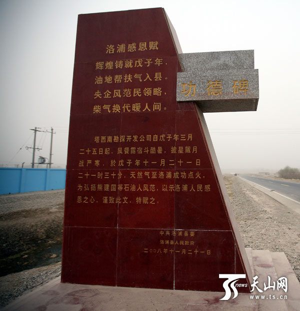 和田洛浦县城南入口矗立着一座高2.5米的褚红色石碑,上面镌刻着一首《洛浦感恩赋》——“辉煌铸就戊子年,油地帮扶气入县。央企风范民领略,柴气换代暖人间。”