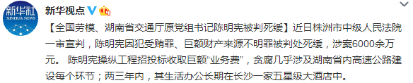 人民网北京9月16日电 据新华视点微博消息,近日株洲市中级人民法院一审宣判,陈明宪因犯受贿罪、巨额财产来源不明罪被判处死缓,涉案6000余万元。 陈明宪操纵工程招投标收取巨额“业务费”,贪腐几乎涉及湖南省内高速公路建设每个环节;两三年内,其生活办公长期在长沙一家五星级大酒店中。