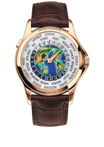 为了将“世界时区”的主题表现得更为鲜明,不少品牌将世界地图做到了表盘上,采用的工艺各种各样,有珐琅、金雕、蚀刻、转印等,使之成为工艺上的一大看点,这其中尤其以珐琅工艺制作的地图为臻品,江诗丹顿、百达翡丽等顶级品牌皆推出过此类表款。而当密密麻麻的城市名字与世界地图相对应时,瞬间为整只手表增添了人情味和浪漫的气息。