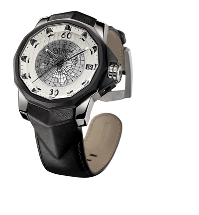 表盘中央设有以北极为中心点的世界地图,搭配24小时时区连格线以及印有白色三角形标志的圆形透明旋转盘,清楚地显示出世界各地时区以及该地昼夜情况。当然这款表上没有城市名称,对于世界时间的显示相对模糊一些。