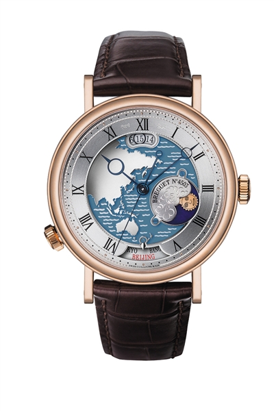 表盘上用18K金镌刻大陆与海洋的图案,通过手工以刻花机雕刻缀以波浪饰纹,上覆半透明亮漆。其中“北京时”纪念款专为中国大陆地区打造,通过腕表8点位置的表冠预先设定和存储“BEIJING”时间,腕表即可实现瞬时跳转至北京时间。