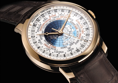 江诗丹顿的世界时间腕表上,用黑色字代表整时区城市,用红色字体代表半时区或四分之一时区城市。佩戴者只需在24小时数字盘上选择所需参考的时间,调校至6时位置的黑三角形上,便可借时针或24小时表盘读取所需地点的标准时间,其他36个时区的时间也会同时显示。