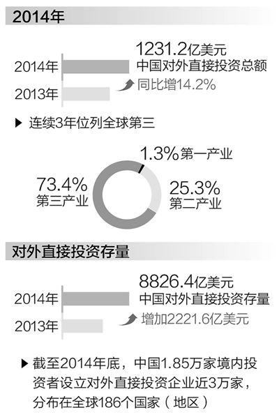 2014年中国对外直接投资全球第三(在国新办新闻发布会上)存量规模全球第八,首次步入全球前10行列