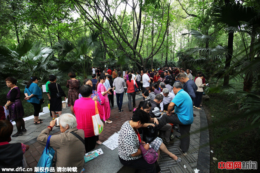 中国网9月19日讯 2015年9月18日下午,四川省成都市,位于市中心的人民公园内,上千父母穿梭于公园内几条贯通的林荫小道上,为自己的子女相亲,场面蔚为壮观,十分热闹,如同农村赶集一般。据观察,公园内一角道路两边摆放着被相亲者的包含收入、职业、性别、年龄、对对方要求等信息的打印纸、牌子,这些信息牌一般是父母带来的。相亲的父或母年龄五、六十者居多,他们边走边看,有的还带着纸笔做记录,如果符合要求的,双方会寒暄一阵子,并且还会留下被相亲者的电话。根据一部分被相亲者牌子信息显示,80后被相亲者居多,也有找老伴的老年人。据了解,成都人民公园相亲角兴起于2005年,目前是周三、周五及周末父母会自发聚集相亲,除了人民公园,距离不远的文化公园也是相亲主要场所。和成都一样,在2005年,上海人民公园、厦门中山公园、北京中山公园、深圳莲花山公园等地,也陆续出现此类“父母代替子女相亲”热潮。
