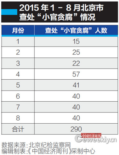 《中国经济周刊》记者查询北京纪检监察网,发现自2015年2月以来,在每月月初公布的截至上月的纪律审查情况通报中,累计查处的“小官贪腐”人数被单独列出已成惯例。北京对于查处“小官贪腐”的重视程度可见一斑。