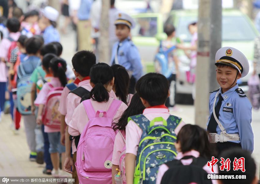 2015年09月21日,河南省郑州市幸福路小学门外,一群身高1.3米上下的“娃娃交警”被派往校门两侧人行道上指挥入校交通。图片来源:CFP视觉中国