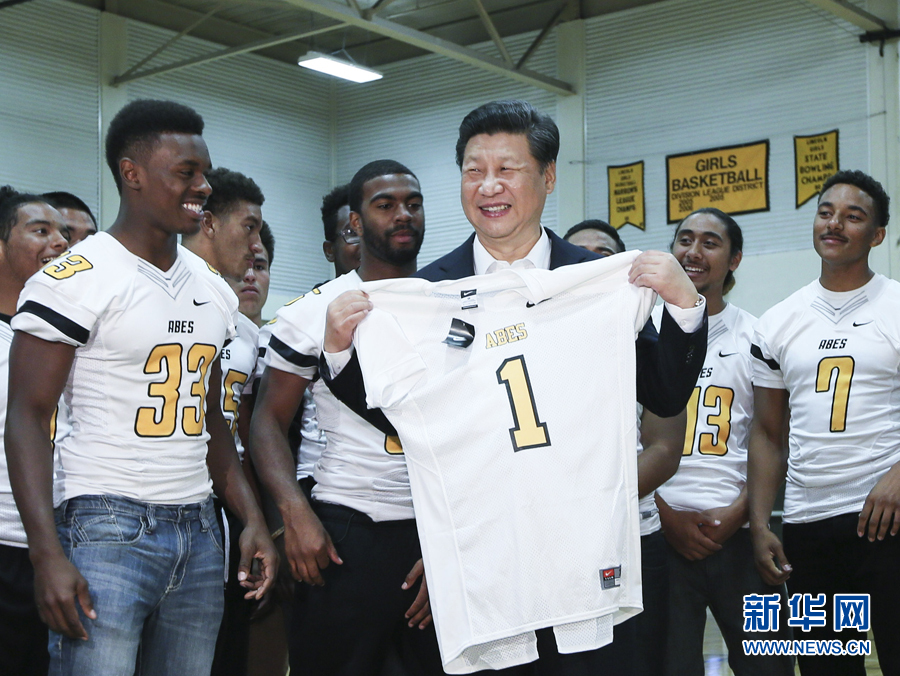 9月23日,国家主席习近平参观美国塔科马市林肯中学。这是习近平接受学生们赠送的橄榄球衣。 新华社记者兰红光摄