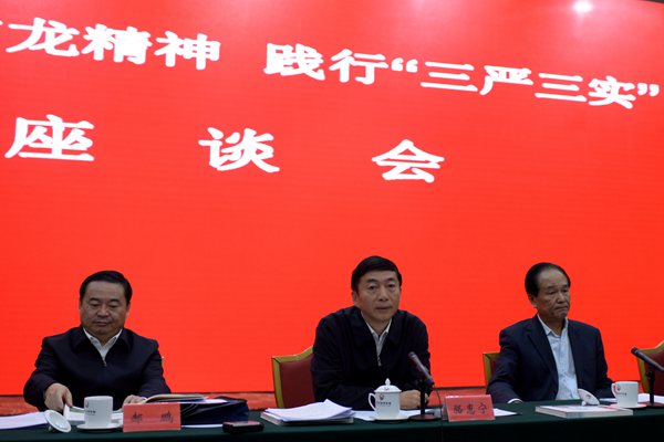 9月25日,中共青海省委书记、省人大常委会主任骆惠宁(中)在“学习尕布龙精神 践行‘三严三实’”座谈会上讲话。