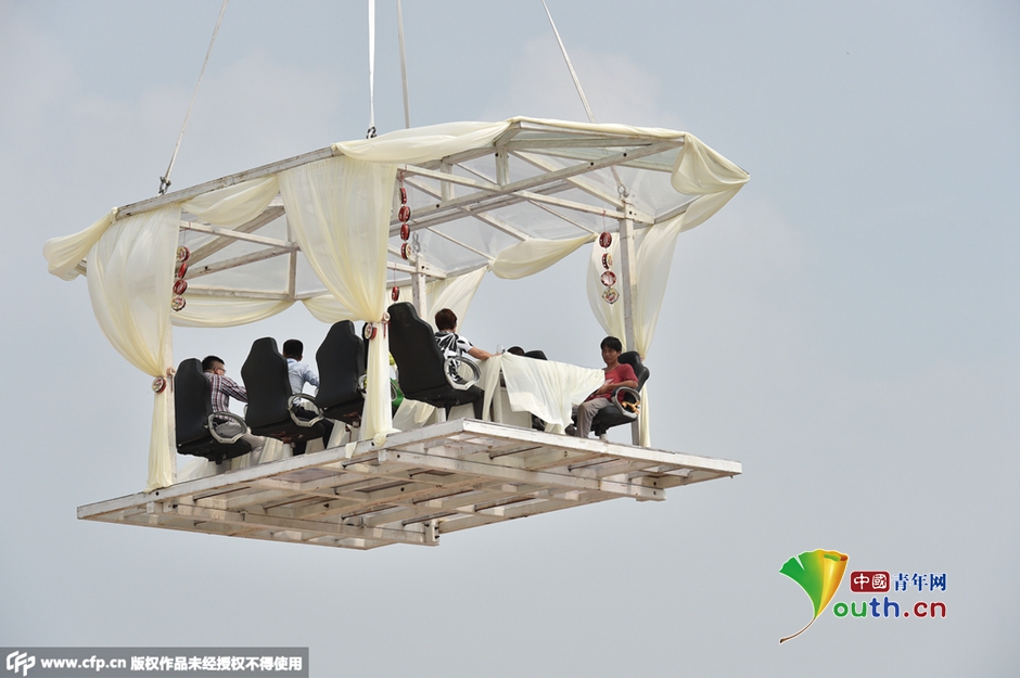 2015年9月24日,合肥万达城举行主题乐园开业倒计时一周年纪念活动,主办方特别开辟空中餐厅,向参观者开放,并可以免费享用午餐。图片作者:视觉中国/CFP