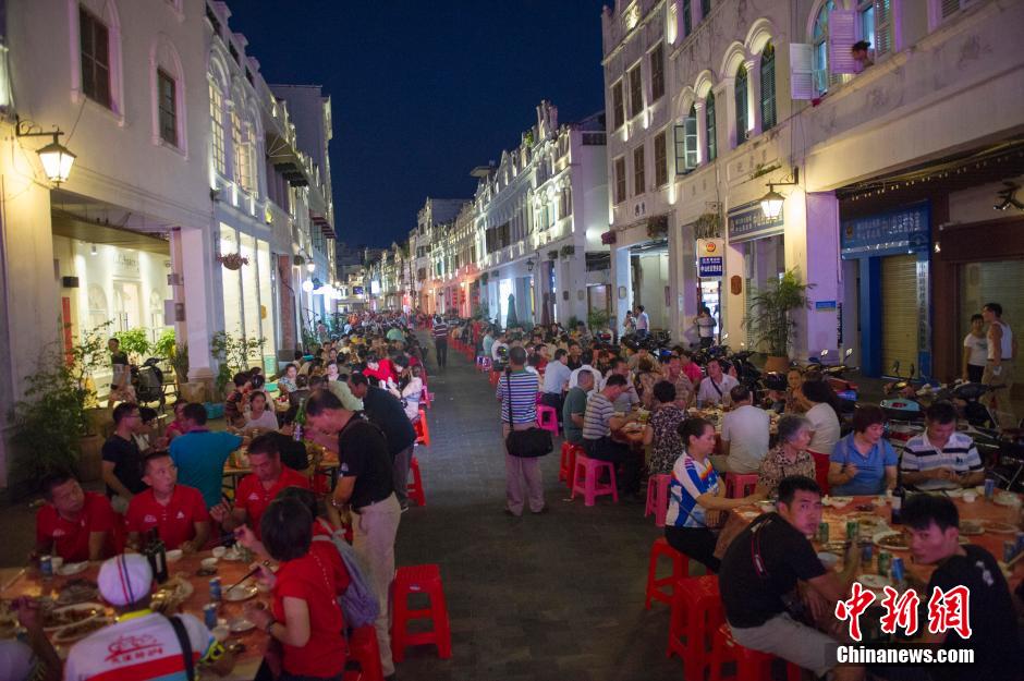 9月24日,中秋临近,海口骑楼老街这个节前格外热闹,街坊摆出了百桌“长街宴”,广邀宾客欢喜迎佳节。据了解,此次“长街宴”摆席上百桌,参加者超过700人,宴席菜品极具海南风格:海南粉、文昌鸡、糯米糕、椰子汁等。 中新社记者 骆云飞 摄
