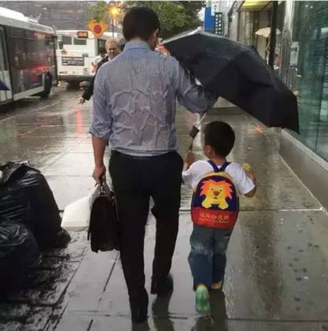 照片中的“雨伞爸爸”是在位于纽约曼哈坦中城的JP摩根大通做投行运营经理的刘侨,他每天下午5点下班后都去法拉盛康华幼儿园接四岁的儿子刘若拙回家,为此他早上7点就开始上班。