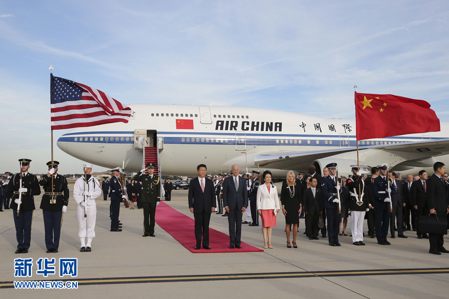 9月24日,国家主席习近平乘专机抵达美国首都华盛顿,继续对美国进行国事访问。美国副总统拜登和夫人专程来到机场,热情欢迎习近平和夫人彭丽媛。新华社记者兰红光摄