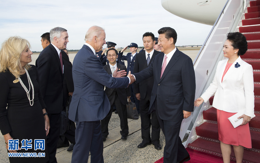 9月24日,国家主席习近平乘专机抵达美国首都华盛顿,继续对美国进行国事访问。美国副总统拜登和夫人专程来到机场,热情欢迎习近平和夫人彭丽媛。新华社记者黄敬文摄