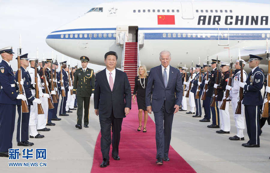 9月24日,国家主席习近平乘专机抵达美国首都华盛顿,继续对美国进行国事访问。美国副总统拜登和夫人专程来到机场,热情欢迎习近平和夫人彭丽媛。新华社记者黄敬文摄